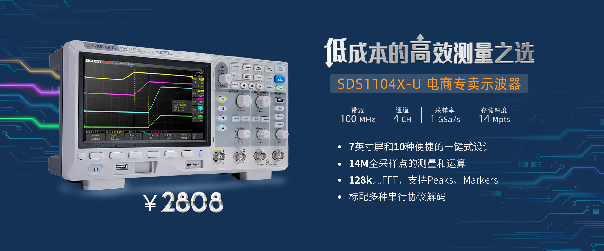作為入門級(jí)數(shù)字示波器,SDS1104X-U帶寬100 MHz,采樣率1 GSa/s,能滿足工程師大部分的信號(hào)測量需求。10種便捷化一鍵操作,38種自動(dòng)測量功能,...